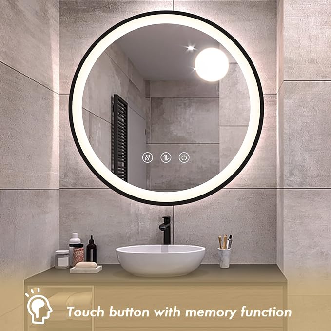 - ✨【Versatile black frame headlight mirror】 LED round 24 inch bathroom mirror, fashionable and simple black frame design, compatible with all your decoration styles. The illuminating mirror is bright enough, with 3000-6000K dimmable design and soft and comfortable light color, which will bring you a different visual experience. This is not only a mirror, but also a work of art in the bathroom, so that you can have a good day.