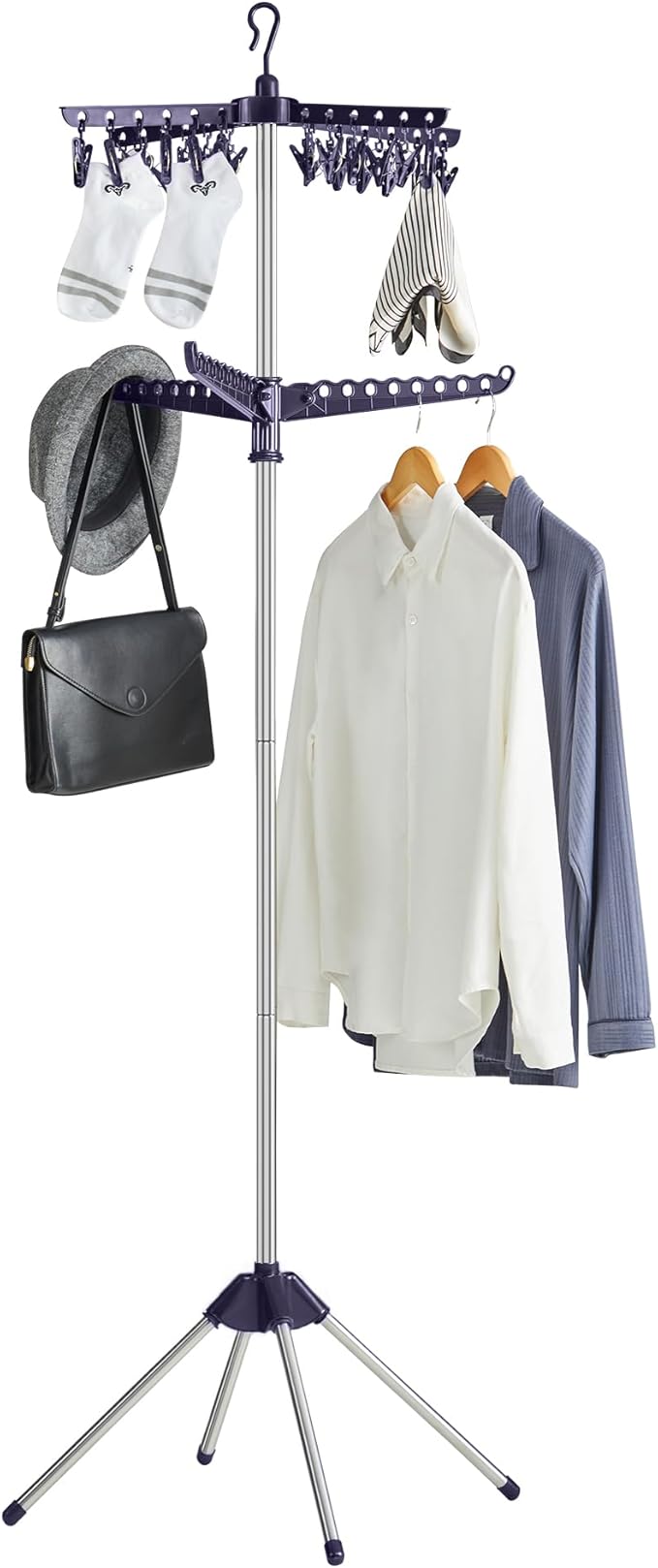 - [Large Capacity] Designed with 27 holes for holding hangers on the second tier and 24 clips on the first tier, this laundry rack can hold lots of clothes and accessories; total max. static load capacity: 35 lb