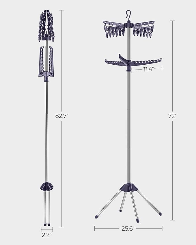 - [Foldable & Space-Saving] Standing at 25.6"D x 25.6"W x 72"H during use, this clothes drying rack takes up little space, perfect for small spaces. Fold the arms and legs into a small size of 2.2"D x 2.2"W x 82.7"H, it will stay out of the way after use