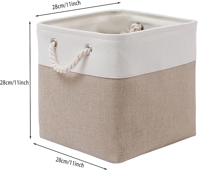 11 x 11 Inch Cube Storage Bins, 6 Pack Large Collapsible Fabric Storage Bin with Ropes, Foldable Storage Cubes for Home, Office,Closet, Clothes, Toys Organizer (White & Beige-11"x11"x11")