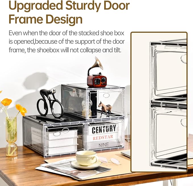 - [Easy to Assemble & Sturdy Hard Structure] Amllas shoe boxes are made of sturdy plastic material.Equipped with strong and sturdy door frame construction,which can keep the shoeboxes strong and not to collapse even when stacked.The corners of the shoebox are smooth,you can complete the assembly process in a few simple steps.