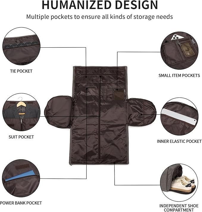 - ✅SUPER MULTI-FUNCTION BAG: The function of hanging clothes bag + various internal pockets (placed with tie, umbrella, wallet, mobile phone, etc.) + large-capacity travel bag, On the side of the leather garment bag, there is a zip pocket accessible for electronics or travel materials.And the bag has a shoe compartment outside and an adjustable shoulder strap with a soft shoulder rest.