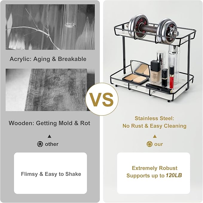 - EASY TO CLEAN: With a sturdy stainless steel frame that can prevent corrosion in wet places and removable ceramic trays with a luxurious marble pattern, this dresser top stand is both functional and easy to clean.