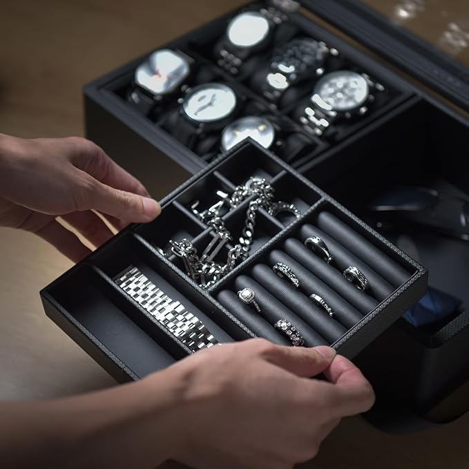 - QUICK SORTING - Removable dividers better classify different accessories. 2-tier watch case helps you find the right accessory quickly and saves you time on busy mornings.