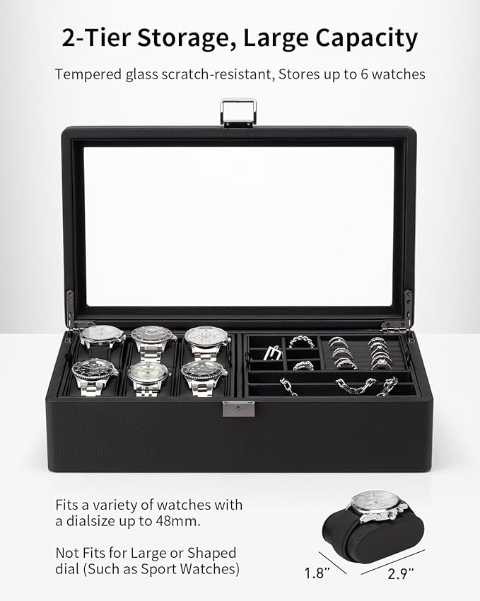 - LARGE CAPACITY &2 TIERS - The top layer has 6 slots and provides comfortable pillows for storage with a dial size up to 48mm. The bottom drawer with large multiple areas to provide extra space for your necklaces, rings, tie, lapel pin, Sunglass and more.