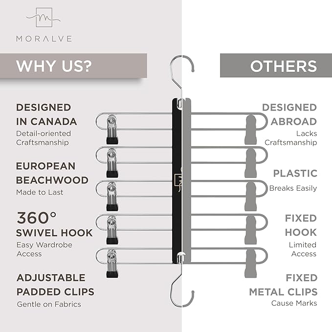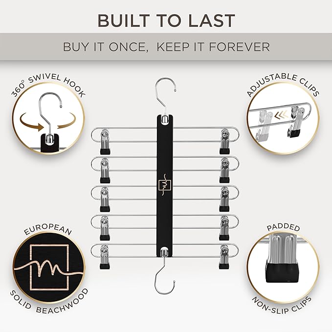 - BUILT STRONG to SECURELY HOLD YOUR CLOTHES - Each of our space saving hangers for clothes are made from premium European beechwood with steel hardware to support up to 30lbs. The multi skirt hangers space saving easy grip clips are non slip to securely hold & support your clothes.