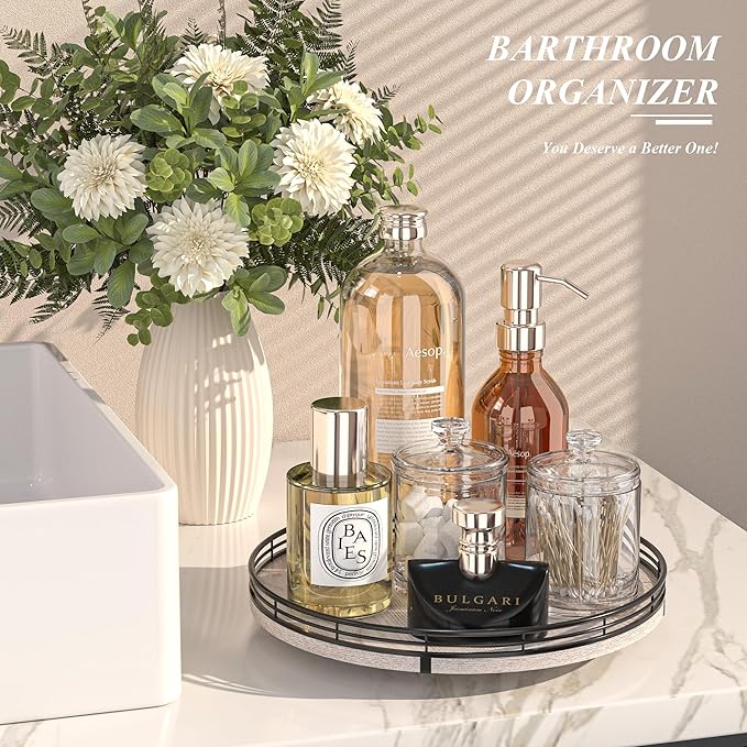 - πππππππππ πππ:This whitewashed lazy susan is enough to be used nearly anywhere, perfect in the bathroom, bedroom, laundry room, office, etc. Keep your bathroom counter organized with this bathroom tray for toiletries, lotion, washcloth, cotton swabs, soap and scrubber. Using a bathroom vanity tray to keep all your daily skin care and makeup. On the bedroom counter, ideal to organize perfumes. Good idea for the office desk and craft room to organize. Keep your coffee stuff perfect at your coffee Station.