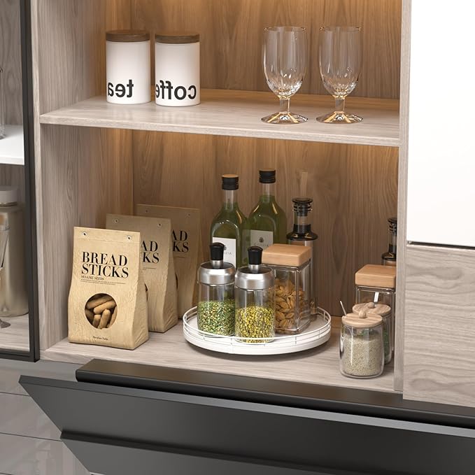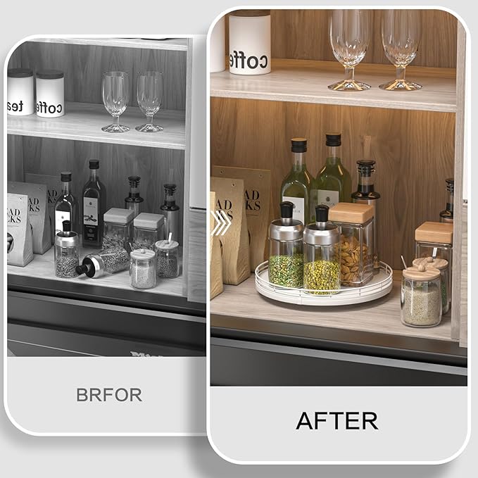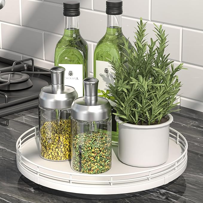 - ๐ง๐ต๐ผ๐๐ด๐ต๐๐ณ๐๐น ๐๐ฒ๐๐ถ๐ด๐ป: The turntable tray features a smooth and silent 360ยฐrotation; Bottom slip-resistant pads for stability and protect your countertop from scratches; Raised edges on each organizer tray to keep items from falling out; Easy to use, no installation required