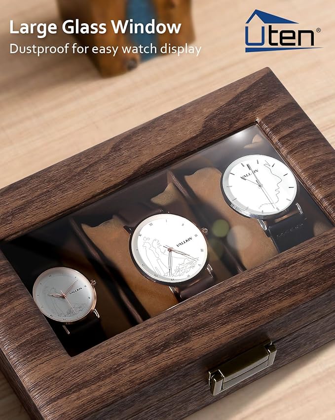 Uten Watch Box 3 Slots, Watch Case Organizer with Real Glass Lid, Wood Grain PU Leather Watch Display Storage Box with Removable Imitation Suede Watch Pillows, Metal Clasp