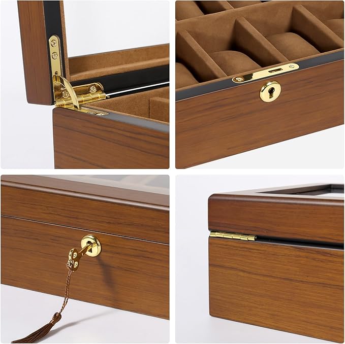 - 【Considerate Details】 Golden metal lock particularly designed for your expensive timepieces safe and secure. This wooden watch case is easy to upkeep, requiring only a quick wipe with a damp clot.