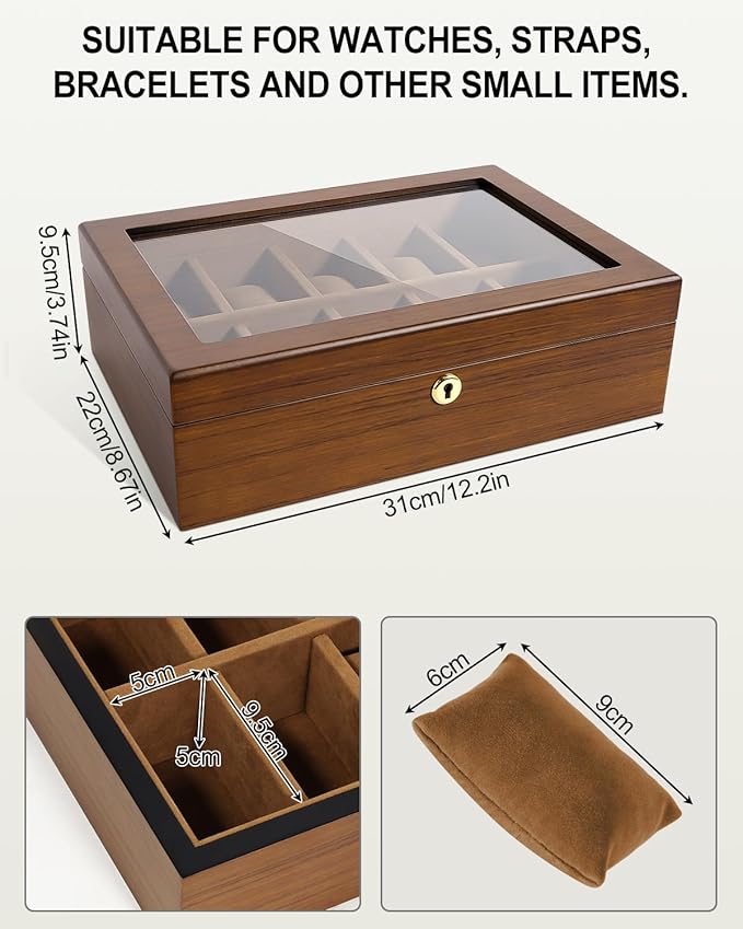 - 【10 Multifunctional Slots】 The watch jewelry box has removable pillows and multi-slots to hold all your favorite watches and accessories. The slots accommodate up to 10 watches with max 52mm dial. Just take out the pillow, this watch box can be turned into a jewelry box to store your accessories, such as storing cufflinks, earrings, rings, bracelets, necklace, brooches and other gadgets.