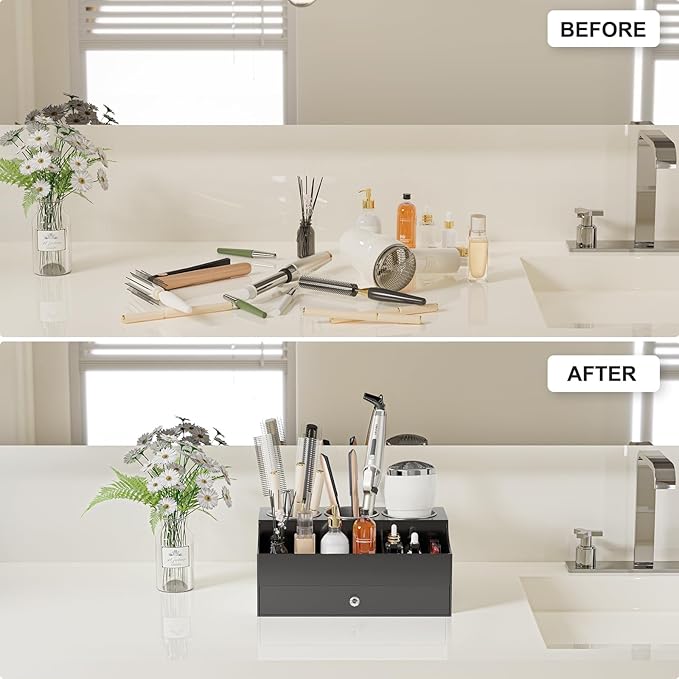 - MAXIMIZE SPACE, MINIMIZE CLUTTER - Our makeup organizer for vanity Organize your hair tools, styling products, and makeup essentials effortlessly. Say goodbye to searching and keep your bathroom clean and tidy. Embrace a clutter-free counter and make the most of your space.