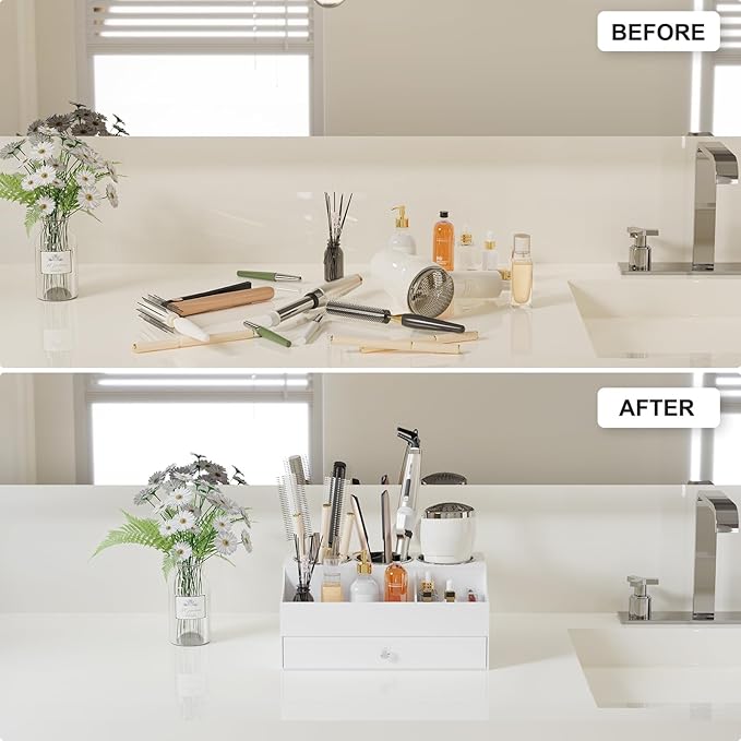 - MAXIMIZE SPACE, MINIMIZE CLUTTER - Our makeup organizer for vanity Organize your hair tools, styling products, and makeup essentials effortlessly. Say goodbye to searching and keep your bathroom clean and tidy. Embrace a clutter-free counter and make the most of your space.