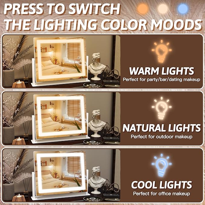 - đă3 Color Lightsă including cold light/daylight/warm light three color settings, the brightness of each color can be adjusted; simulating lighting in various occasions to meet personal makeup needs.