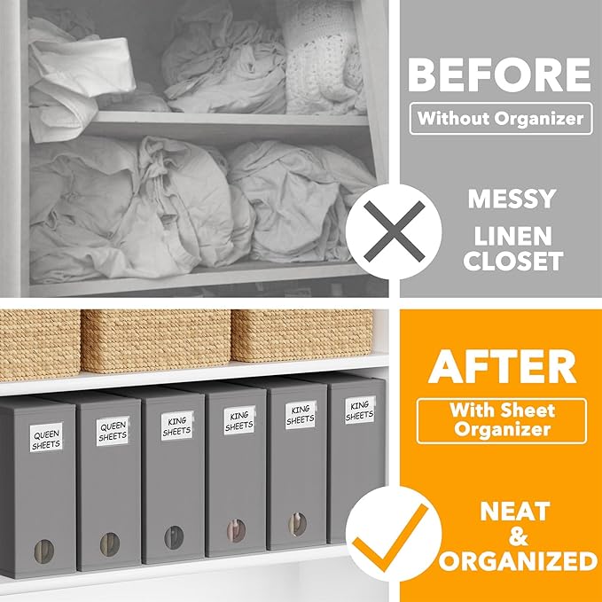 - LABEL CARDS INCLUDED - With the removable label on the bed sheet storage organizer keeper, you can identify the linen content instantly, which will save so much time