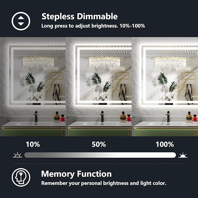 - âšăColor Changeable & Brightness Adjustable & Memoryă- Yeelait lighted mirrors for bathroom wall features multiple light settings that are easily controlled with sensitive touch buttons. Short press the button to change the light color: White (6000K) - Neutral (4000K) - Warm(3000K), long press the button to dim the brightness to your comfortable level (100%~10%). The Smart Memory Function will record the lighting setting and keep the previous lighting status after turning off and on.