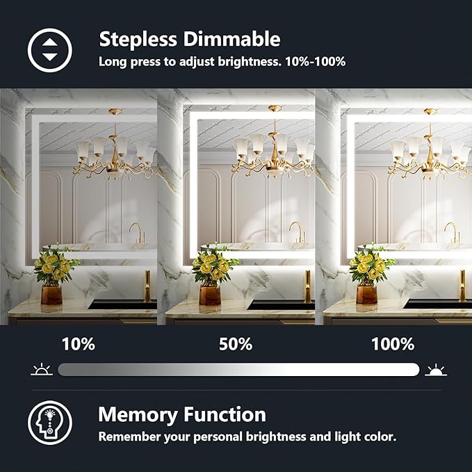 - âšăColor Changeable & Brightness Adjustable & Memoryă- Yeelait lighted mirrors for bathroom wall features multiple light settings that are easily controlled with sensitive touch buttons. Short press the button to change the light color: White (6000K) - Neutral (4000K) - Warm(3000K), long press the button to dim the brightness to your comfortable level (100%~10%). The Smart Memory Function will record the lighting setting and keep the previous lighting status after turning off and on.