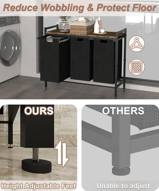 - Sturdy and Stable: These clothes hampers for laundry are equipped with four foot pads that can be adjusted in height. When the floor is uneven, each foot pad can be adjusted individually to maintain the overall balance of the 3 bin laundry hamper. Constructed with sturdy wood and steel, this laundry sorter 3 section is built to withstand the test of time.