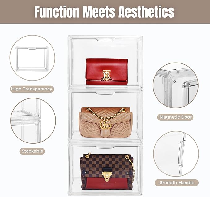 10Pack Purse Organizer for Closet Clear Acrylic Display Case Handbag Storage Organizer Box with Magnetic Door Stackable Storage Bins with Dustproof Lid for Book Toys Shoes Cosmetic Collectibles