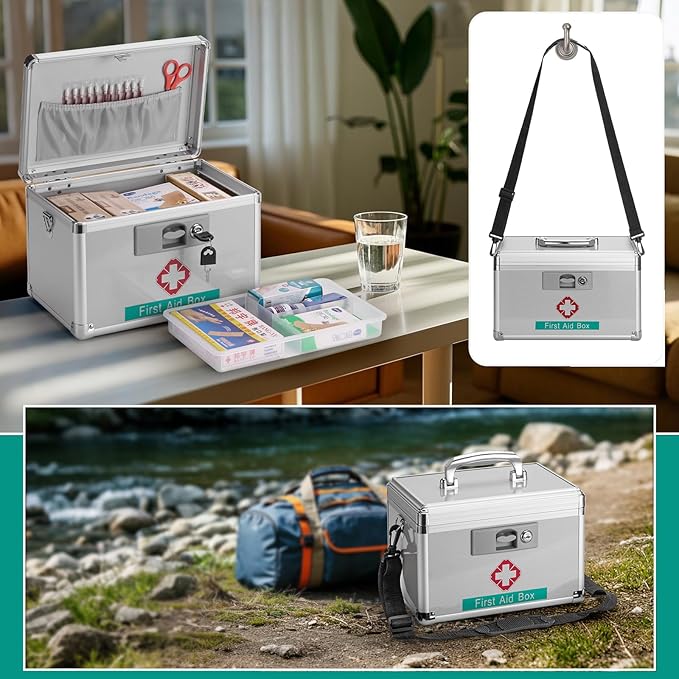 - PERFECT SIZE: Measuring 11.2 x 7.6 x 7.6", silver, unique lock with 2 keys + shoulder strap. our locking medicine box can store up to 13-15 pill bottles or any other small first aid