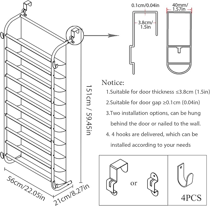 - Shelf size space: 10 Tier Door hanging shoe rack can hold 30 pairs shoes to help you maximize the space, Size of 20.05” L x 7.87”W x 59.4”H. This modern shoe rack will keep your entryway, shoe rack for closet small space, Suitable for use on doors, or walls;