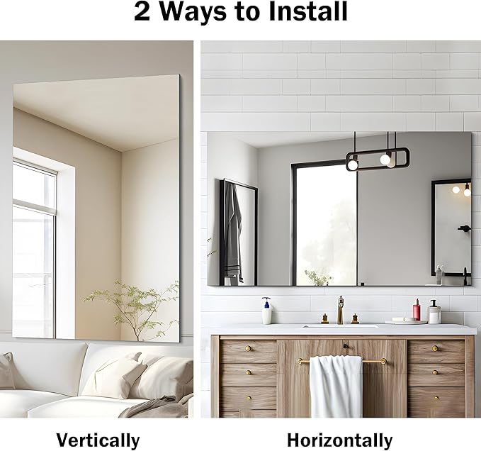 - Effortless Installation: Say goodbye to complicated setups. With included wall-mounted hardware, our frameless rectangular mirror can be securely and effortlessly installed in just a few minutes. Whether you prefer a vertical or horizontal orientation, our 48 inch vanity mirror no frame adapts seamlessly to your needs. Save time and start enjoying your mirror sooner with easy and quick installation