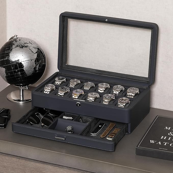 ROTHWELL Luxury Watch Box for 12 Watches – PU Leather Watch Box with Real Glass Lid – Slide out Accessory Drawer with Multiple Compartments (Carbon)