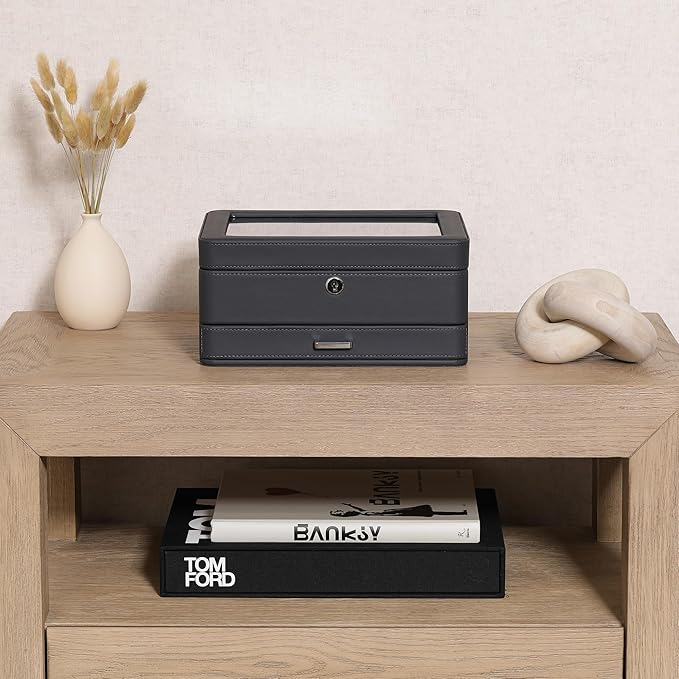 - VALET DRAWER: The slide-out accessory drawer is perfect for storing additional watches, watch straps, cufflinks, rings, tie clips, sunglasses, pens, money, cards, or watch tools. Maximize your storage options with this versatile and accessible feature.