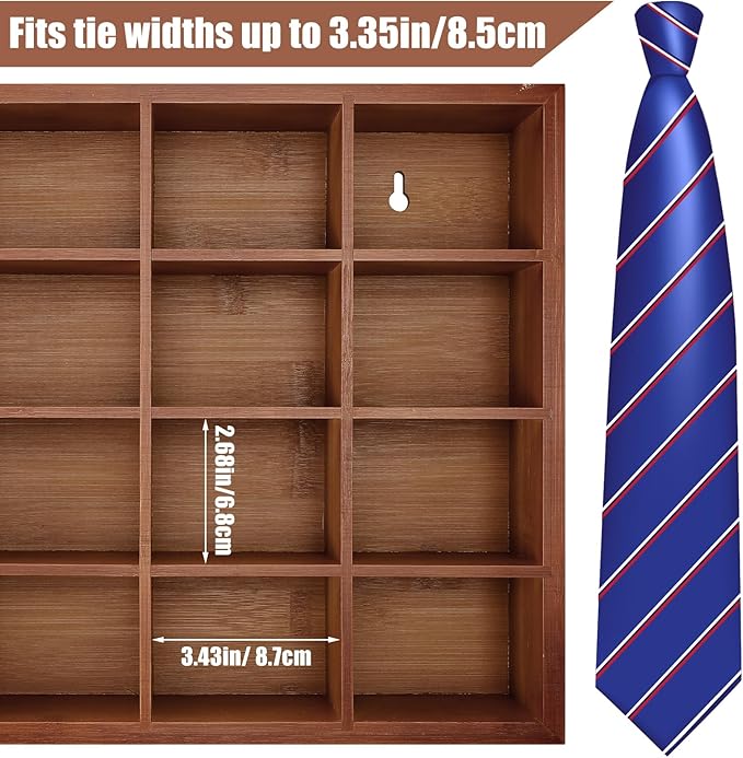 - Suitable Size: the overall size of this tie box is about 14.96 x 11.81 x 2.76 inches/ 38 x 30 x 7 cm ( L x H x W), and the compartments size are about 3.43 x 2.68 inches/ 8.7 x 6.8 cm, which are suitable for storing neckties about 3.35 inches/ 8.5 cm or narrower; And they are also ideal for storing watches, keys, tie clips, key cards, cuff links, and other small items