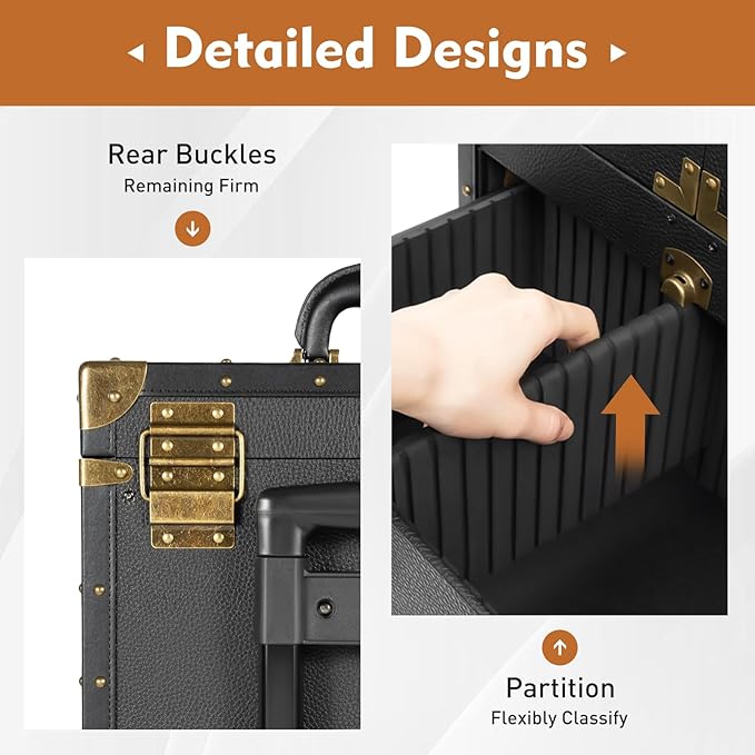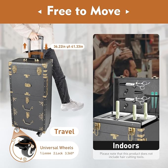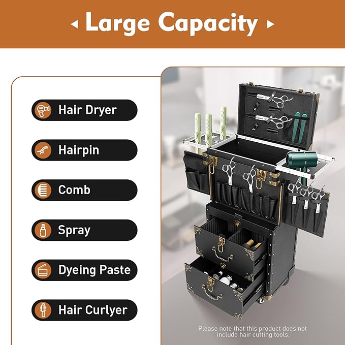 - Wide Applications: This multifunctional makeup travel case is very easy and convenient to clean. You can use a wet towel to wipe away dust and dirt from the surface and inside of the drawers.: The built-in compartmentalized pouch effectively organizes small hairdressing tools such as scissors, combs, and hair clips, allowing each tool to remain separate and tangle-free.This trolley makeup train case is suitable for placing hair coloring materials and tools. This beauty salon luggage is suitable for barber stores, hairdressing colleges, homes, etc.