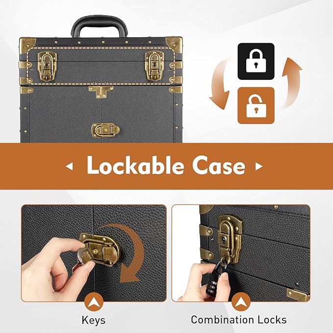 - Rolling Train Case:You can set a code with the individual combination lock or use a key to protect your large cosmetic organizer , both locking options can be used simultaneously. The lockable design ensures the security and privacy of the hairdressing tools. Max. Load-bearing Capacity: About 25kg/55.12lbs,Net Weight: 9.1kg/20.06lbs,Product Size: 39*25.5*82cm/15.5*10*32.3in