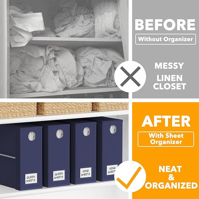 - NAVY BLUE SHEET ORGANIZERS 4 PACK - Make your linen closet organized and beautiful with this foldable bed sheet fabric organizer; Each Storage Organizer SIZE: 5"W x 15"D x 12.8"H