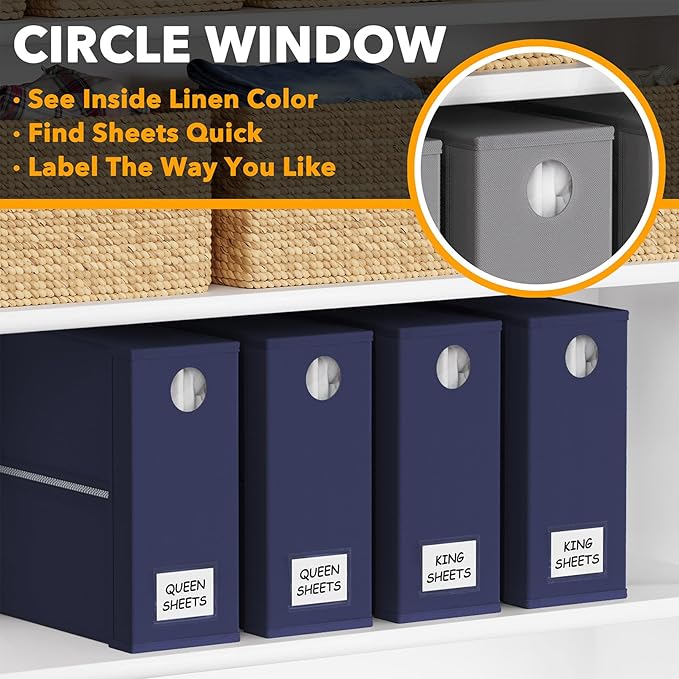 - CIRCLE WINDOW DESIGN - You can see the linen color clearly through the front circle window; This sheets organizer container is beautiful and modern that will fit any home style