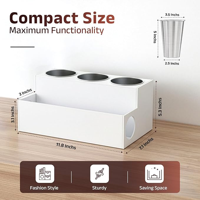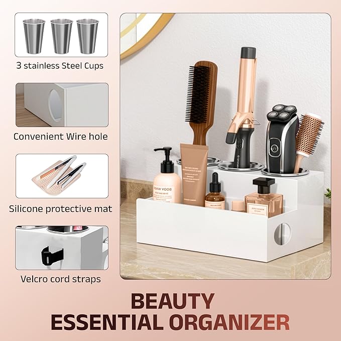 - STORE TOOLS WITH CONFIDENCE: Store safely with hot tools organizer’s three stainless steel cups that cool down flat and curling irons without damaging your accessories. Designed for heat resistance, these cups offer a reliable solution for storing tools post-use