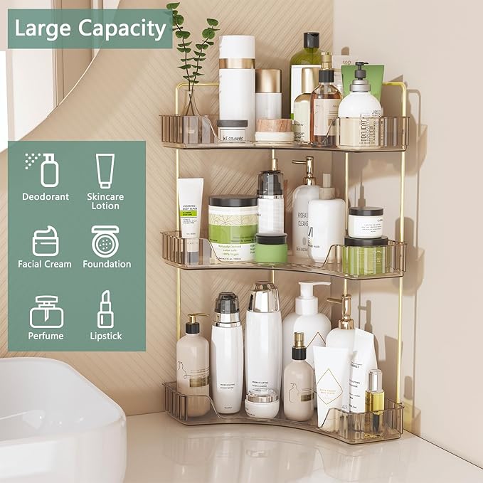- 【Utilizes corner space effectively】 This 3-tier bathroom countertop organizer maximizes the use of overlooked corner spaces, providing ample storage for skincare products, cosmetics, and other bathroom essentials. The gold rods of the top shelf keep items from falling off the back. The transparency of the plastic also allows you to see the items stored on each shelf easily, making it convenient to find what you need quickly