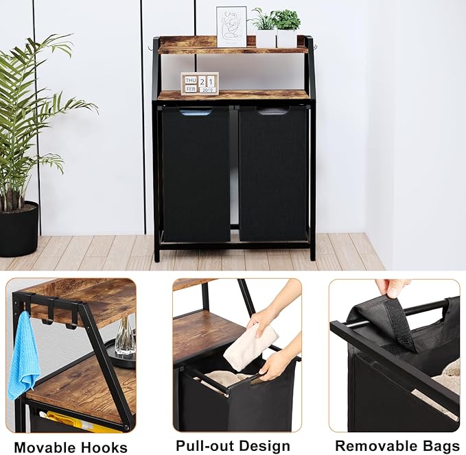 - Laundry Sorter with 2 Shelves - This laundry basket comes with 2 shelves and 3 hooks, providing extra space to store detergent and other essentials, keeping everything organized and easily accessible