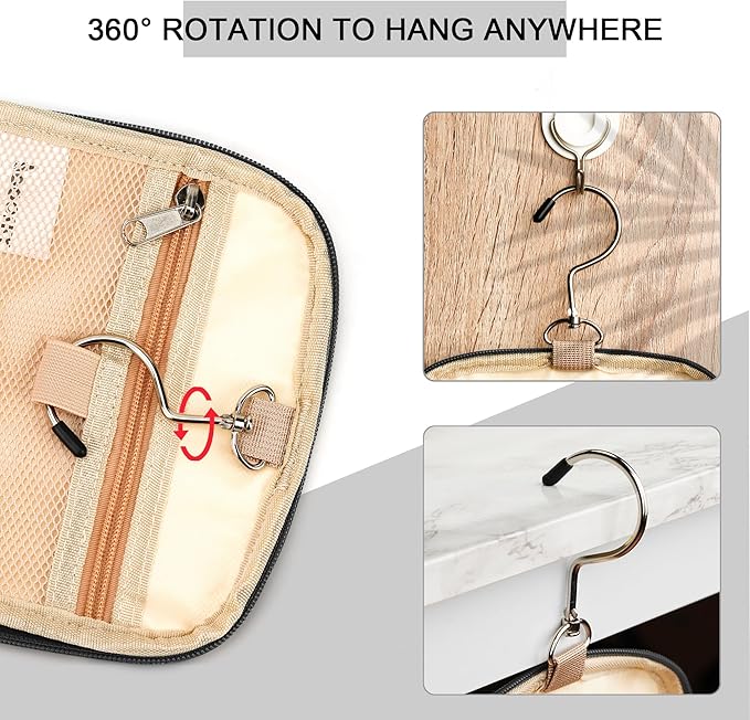 - CONSIDERABLE DESIGN - The elastic band and elastic mesh bag in the main compartment and two side compartments can keep the bottle fixed and upright. It has two waterproof compartments specially used for storing wet items. You can put your wet towel, toothbrush, shaving kit, and leaky cosmetics in it. The 360 degrees rotate metal hook gives you a variety of hanging options.