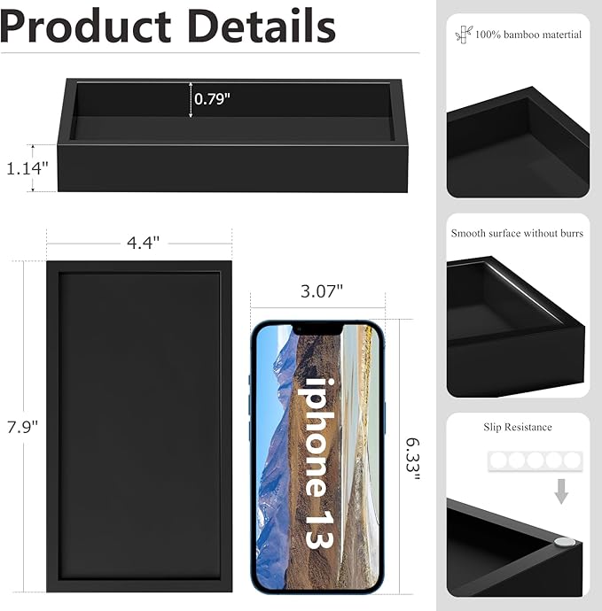 - Perfect Size and Durability: Our decorative tray, measuring 7.9”x 4.4”x 1.14”, showcases your items beautifully. Crafted from premium bamboo, it's easy to clean and built to last, ensuring long-lasting use