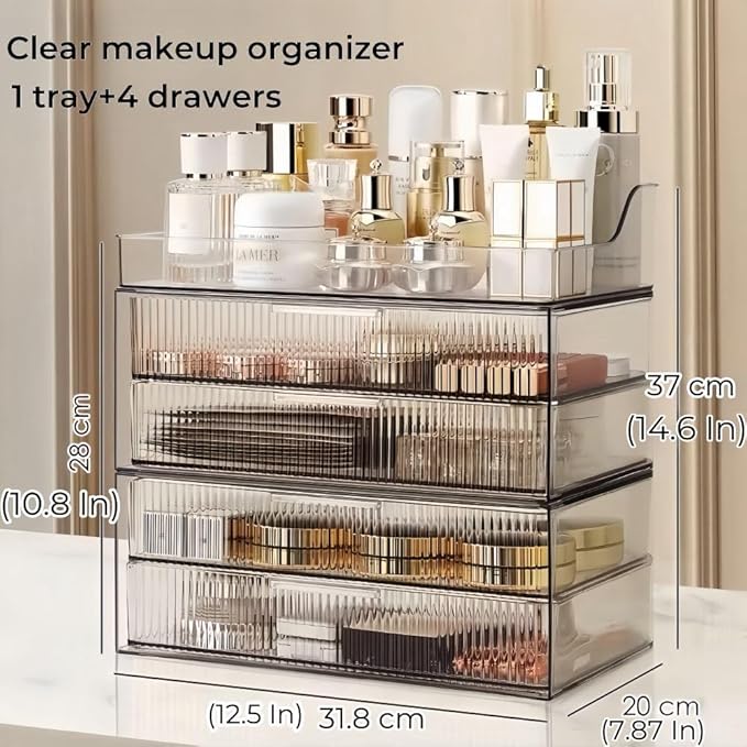 - ๐ใ Fashionable Appearance ใ๐: The semi transparent vertical pattern design of the cosmetic organizer device not only enhances the beauty of the product, but also allows you to see the items in the drawer at a glance