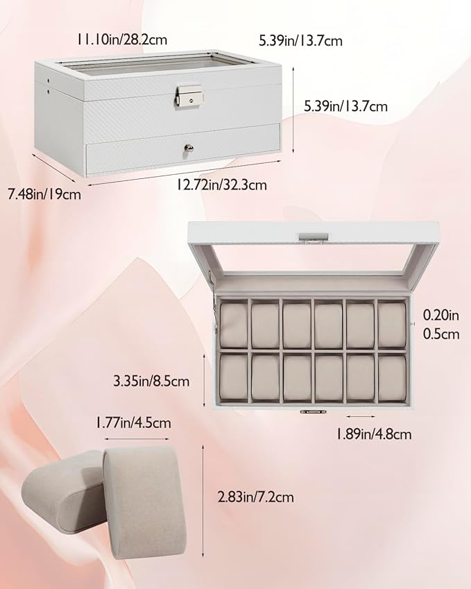 - [DOUBLE LAYER]: In the top layer of the jewelry case, there are 12 watch slots with removable velvet pillows. And in the bottom layer, there are adequate suitable area for your cufflinks, necklaces, bracelets, earring, brooches,sun glasses and any other jewelry and belongings