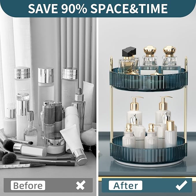 - 👒360 Rotating Design: This rotating makeup organizer is different from other makeup organizers, it can easily rotate 360 degrees, and its rotating base and high tray edge prevent spills, it not only helps you organize your cluttered desktop space but also easily rotate to choose what you want Items.