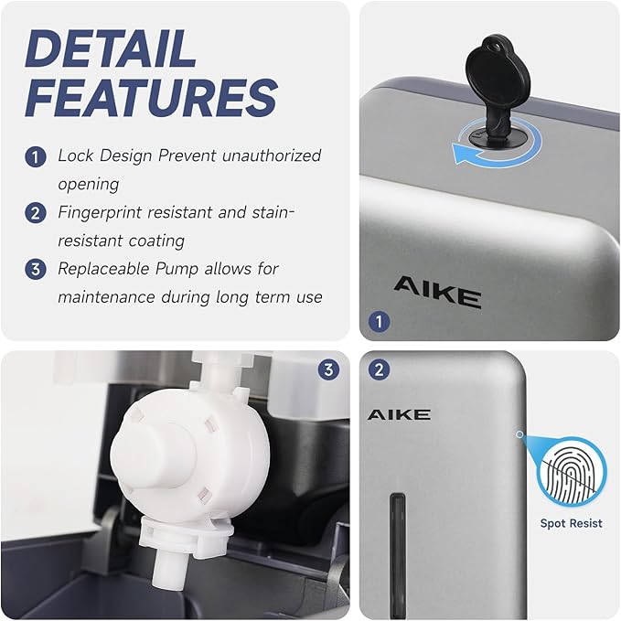 AIKE Wall Mount Liquid Soap Dispenser for Commercial Bathroom 27oz Large Capacity Manual Push Pump Silver