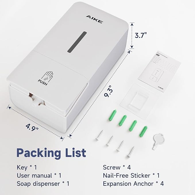 AIKE Wall Mount Liquid Soap Dispenser for Commercial Bathroom 27oz Large Capacity Manual Push Pump Original White