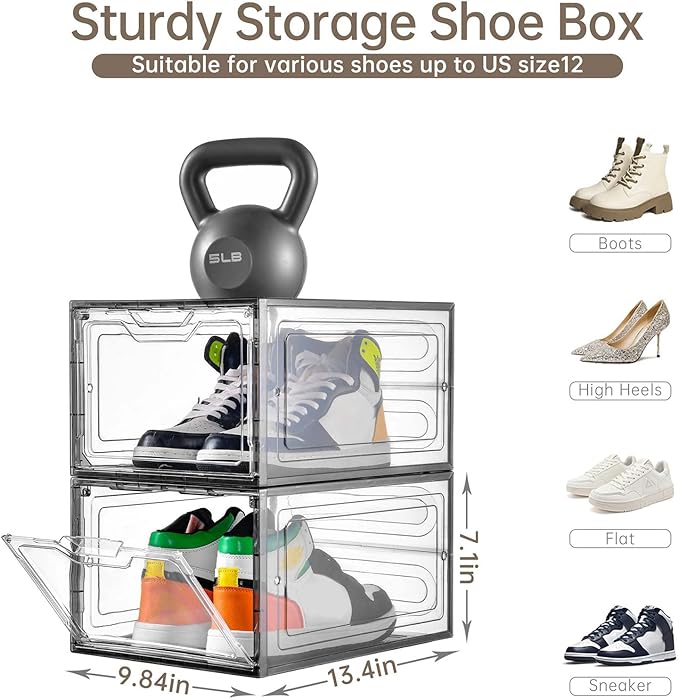 - Thoughtful Design: Clear magnetic front door, Stackable design,Shoe storage boxes allow you put sneakers in the box, fits various types of shoes. Sneakers, heels, flats, flip flops, sandals, wedges. Find right shoes through clear front door with a glimpse.