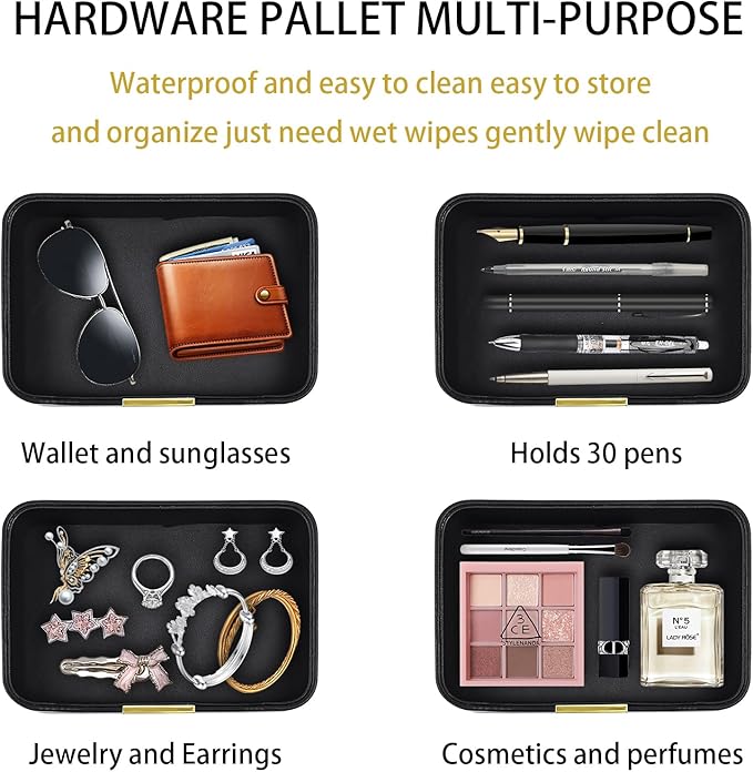 - Widely Used - This leather tray with metal is suitable for use in a variety of settings, from homes to offices. It can be used to store keys and other small items in an entryway or to keep jewelry organized on a dresser,this one could be used to store small office supplies like pens, paperclips, notebooks, remote controls, mobile phones, school glue sticks, marker, note paper, business cards, stapler, scissors and so on,Small trays are also perfect as gifts and you can buy with confidence!