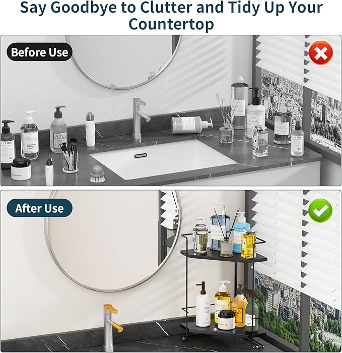 - Space-Saving Corner Bathroom Counter Organizer: 2-tier corner bathroom organizer has a unique 90-degree corner design, and can prefect use usually underused corner space. Save your counter space, keep your space organised and clutter-free, with countertop items easily accessible.