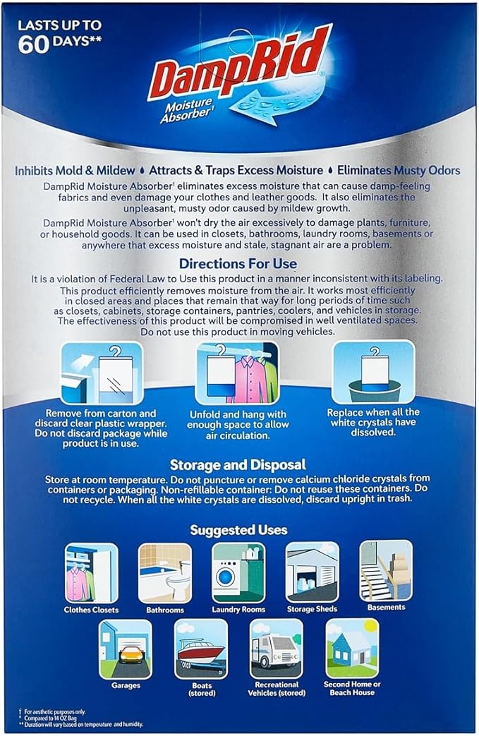 - DEAL FOR CLOSETS: Damp Rid Hanging Moisture Absorbers make a great closet or dorm room dehumidifier, eliminating musty odors and excess moisture that can cause damp-feeling fabrics and damage to your clothes and leather goods.