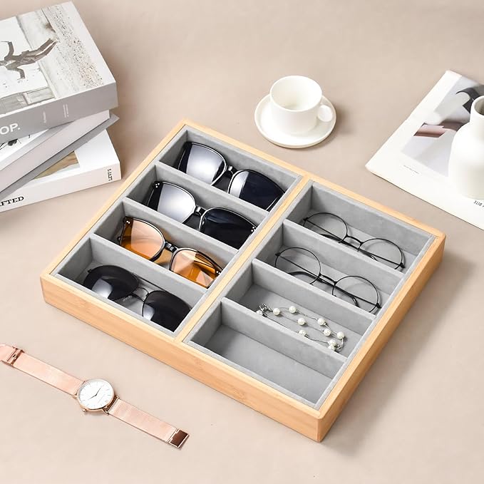 - Multifunctional - The eyeglass tray is used for glasses display, jewelry/ cosmetics/ socks/tie and more home storage. Provides plenty of space for a wide variety eyeglasses.