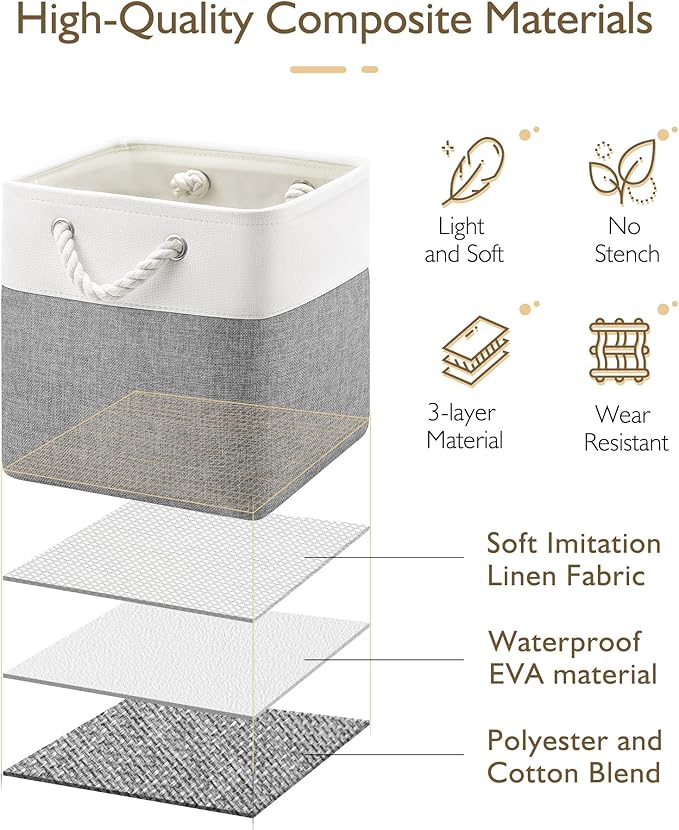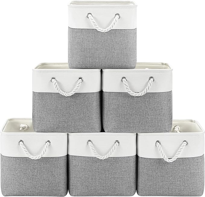 11 Inch Storage Cubes 6-Pack, Foldable Fabric Organizer Bins with Rope Handles, Cube Storage Baskets for Closet Shelves and Home Organization(White/Gray)