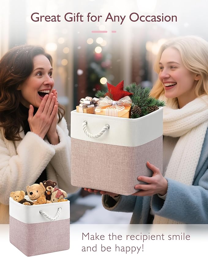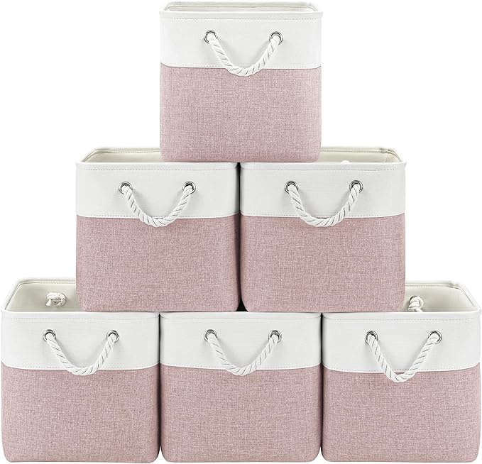 11 Inch Storage Cubes 6-Pack, Foldable Fabric Organizer Bins with Rope Handles, Cube Storage Baskets for Closet Shelves and Home Organization(White/Pink)
